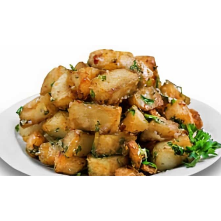 Légumes concassés, sauce à l’ail, salade, tomate, navets marinés et viande.