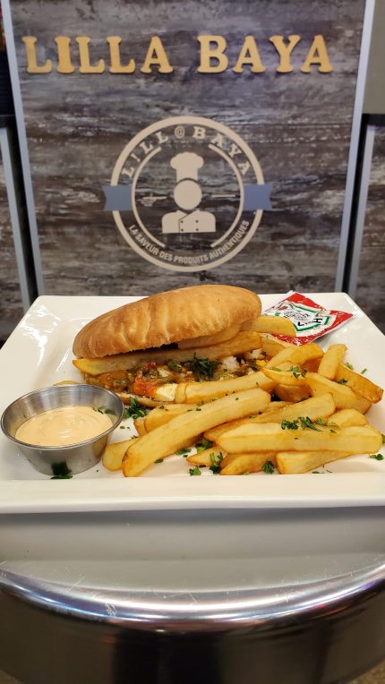 Ingrédients tacos à l’agneau effiloché: Tortillas, mayonnaise maison, salade laitue, tomate, agneau effiloché, fromage et patates. Servi avec frites et une boisson gazeuse.