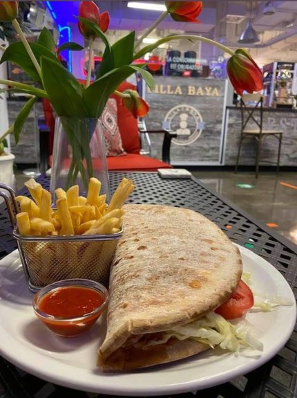 Ingrédients tacos: Tortillas, mayonnaise maison, (thon ou poulet ou crevettes ou boeuf ou merguez selon votre choix), fromage et patates. Servi avec frites et une boisson gazeuse.