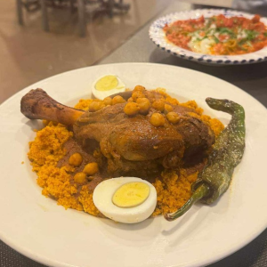 Poulet rôti avec daghmira : saveur dorée du poulet parfumé aux épices, accompagnée d’une sauce daghmira riche et onctueuse aux notes traditionnelles.