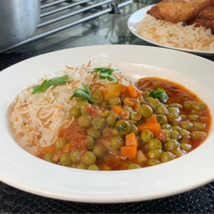 Mélange savoureux d’haricots verts mijotés accompagné d’un riz doré aux vermicelles.