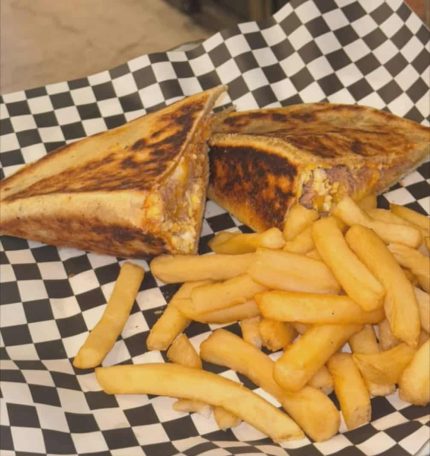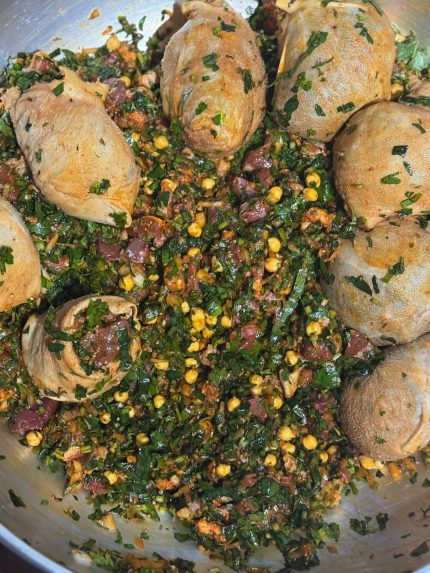 Blé  grillé accompagné de morceaux de poulet tendre et d’épices parfumées.
