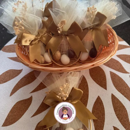 Limmima met à votre disposition des coffrets cadeaux personnalisés, pour naissance, baby shower, mariage et fiançailles. Le modèle sera personnalisé selon votre goût, couleur du tissu/ voile, fleur et dragées. Des dragées amandes, amandes enroulées de chocolat au lait ou de chocolat au café latté . Possibilité d’écrire votre prénom ou celui de votre bébé.