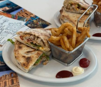 Ingrédients: poulet, fromage, sauce, tomates et légumes frais, frites et boisson