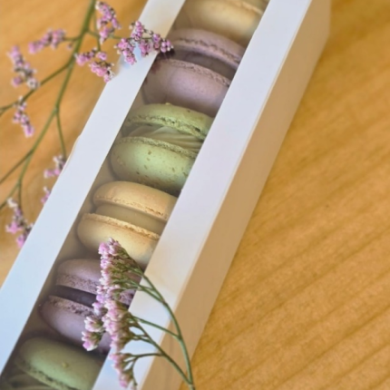 Boîte de 12 macarons assortis : 3 macarons par parfum choisi, soit un total de 4 saveurs au choix.
