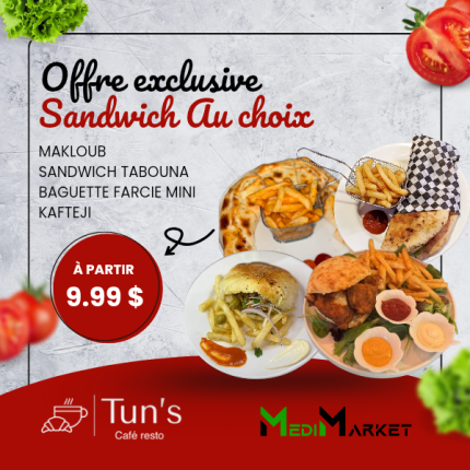 Un trio gourmand au choix : makloub, sandwich tabouna, baguette farcie ou mini kafteji, accompagné de frites dorées et croustillantes et boisson.