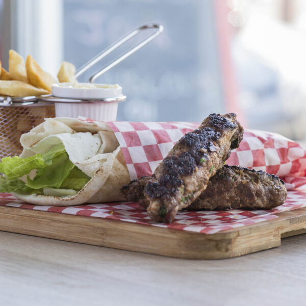 Boeuf et épices, sauce à l’ail, salade, tomate, navets marinés et viande.