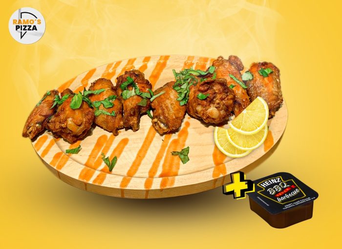 Des ailes de poulet épicées avec une sauce trempette et coulis de votre choix.