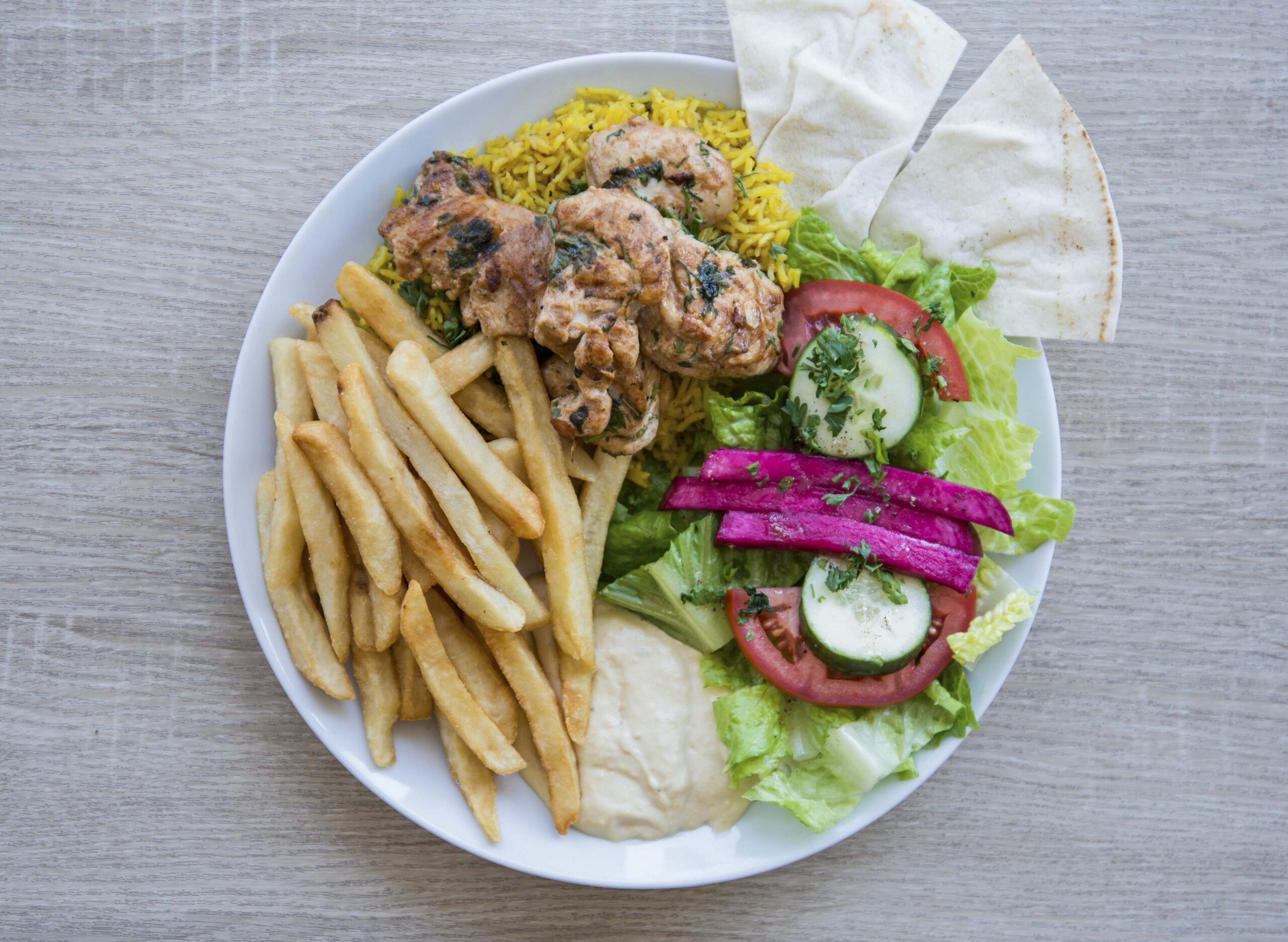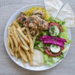 Assiette brochette de poulet servie avec salade, riz et des frites