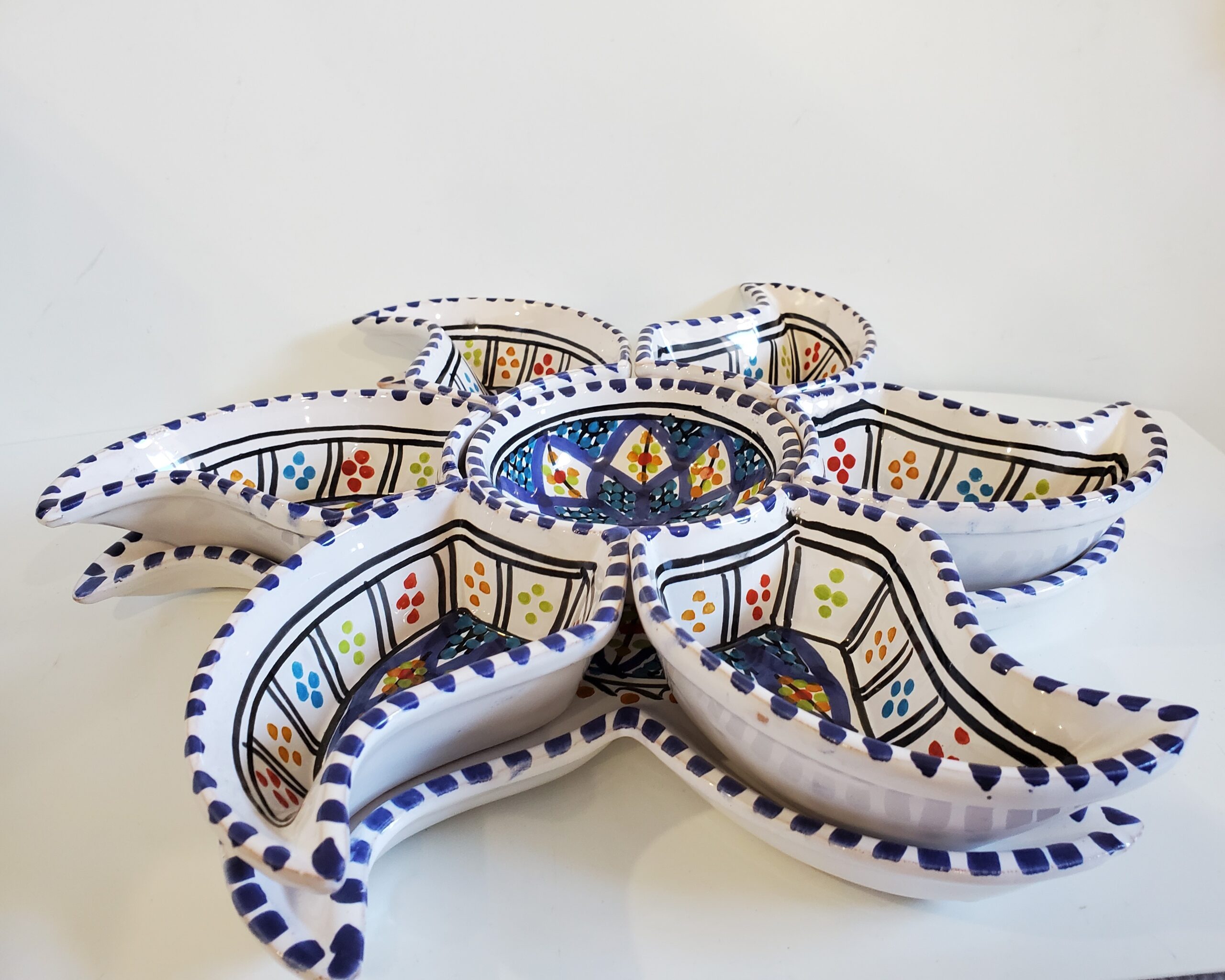 Ensemble de 7 assiettes de service en céramique , peints à la main et décoré de beaux motifs tunisiens. Idéal pour les fêtes et les occasions spéciales pour servir des sauces, des trempettes, des apéritifs, des biscuits et plus encore.