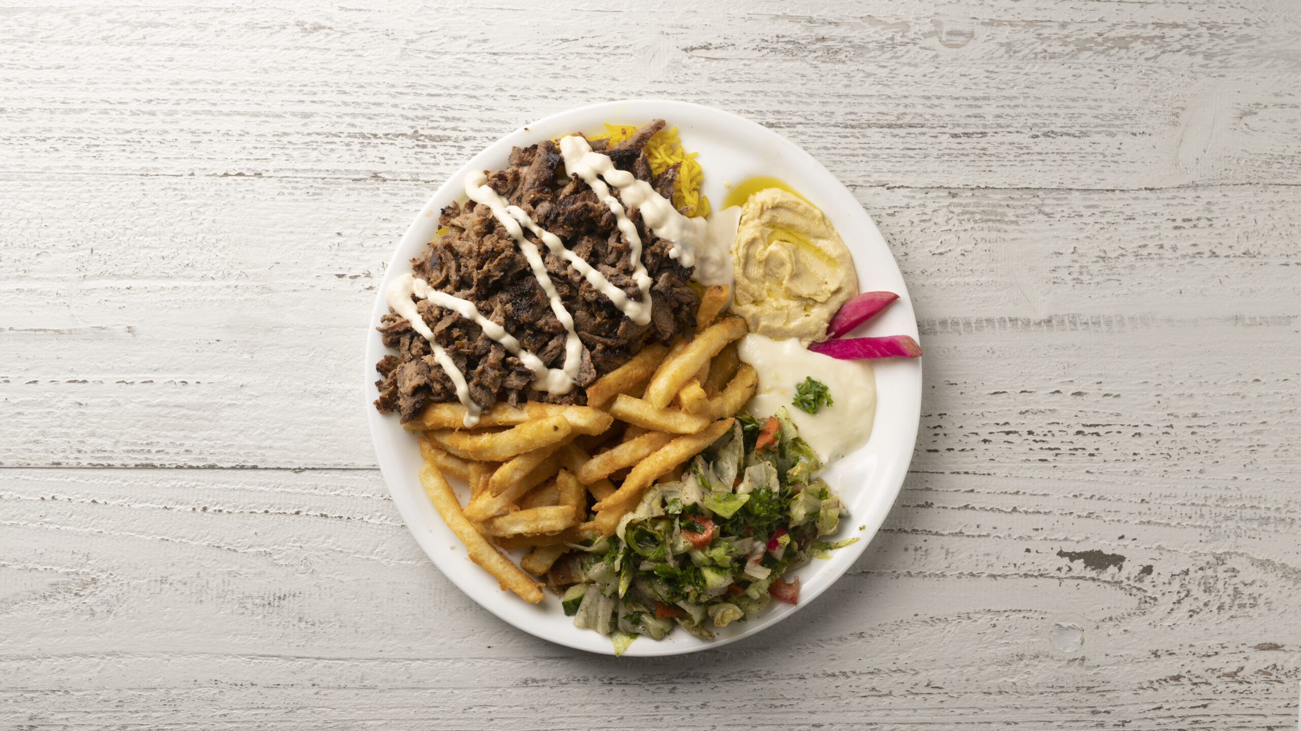 Une assiette de shawarma de bœuf servie avec du riz basmati, salade, hummus et sauce à l’ail avec frites.