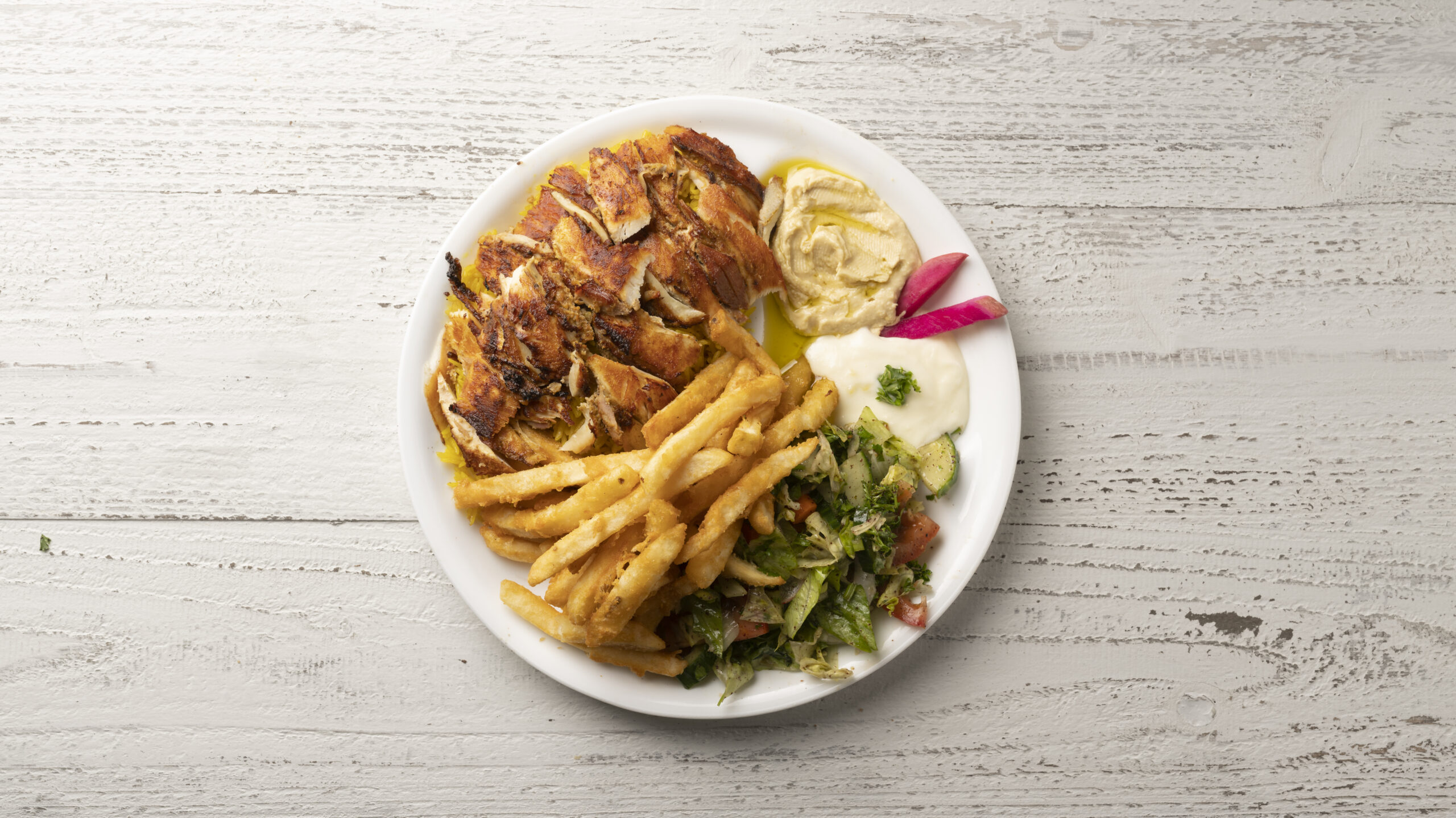 Une assiette de shawarma de poulet servie avec du riz basmati, salade, hummus et sauce à l’ail avec frites.