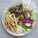 Assiette kefta servie avec salade, riz et des frites