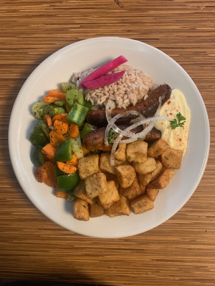 Une assiette Merguez est servie avec salade, riz, patates, agneau, pita et sauce a l’ail.
