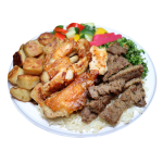 Assiette mixte — sélection de viandes halal savoureuses, accompagnée de salade fraîche, riz parfumé et patates dorées pour un ensemble généreux et complet.