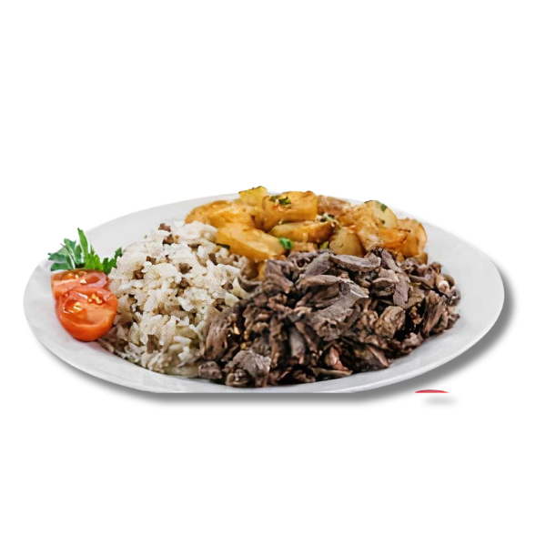 Assiette Shawarma Boeuf servie avec salade maison, riz ,patates épicées et sauce sésame.