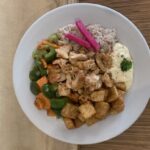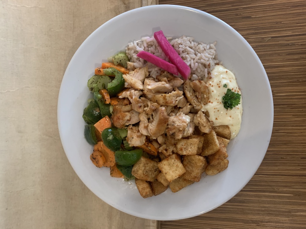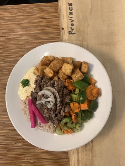 Une assiette shish est servie avec salade, riz, patates, poulet mariné, viande, pita et sauce a l’ail.