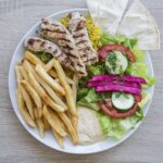 Assiette Shishtaouk servie avec une salade, riz et des frites