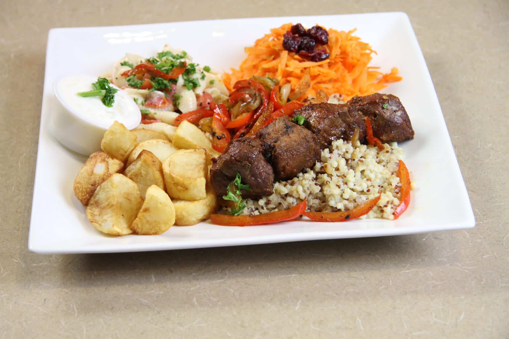 Une assiette steak casa servie avec 2 choix de salades, riz et frites