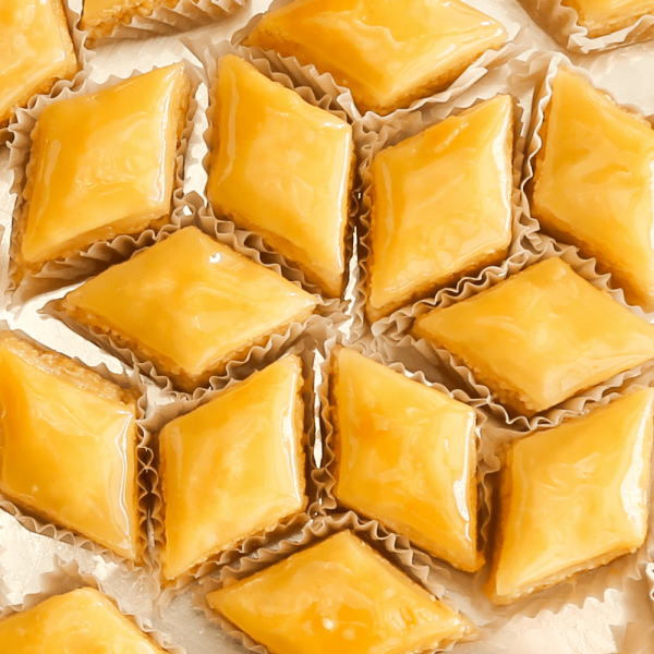 Préparée de feuilles de pâte phyllo fait à la main et bien superposées en les enduisant d’huiles d’olive extra vierge. à l’intérieur se trouve un délicieux mélange d’une poudre d’amande avec de l’eau de fleur d’orange.