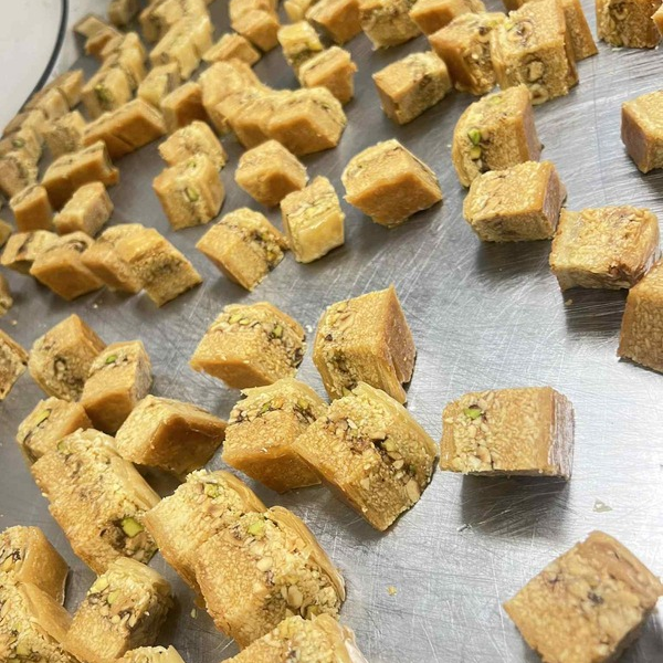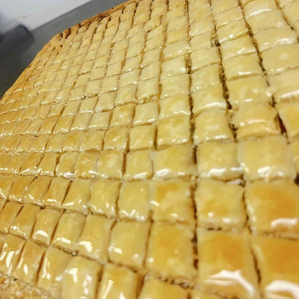Préparée de feuilles de pâte phyllo fait à la main et bien superposées en les enduisant d'huiles d'olive extra vierge. à l'intérieur se trouve un délicieux mélange d'une poudre d'amande avec de l'eau de fleur d'orange.