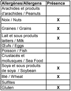 Peut contenir des traces de noix, œufs, lait, soya et sulfites.