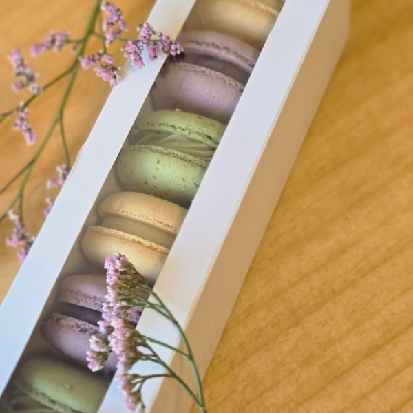 Boîte de 6 macarons assortis : 2 macarons par parfum choisi, soit un total de 3 saveurs au choix.