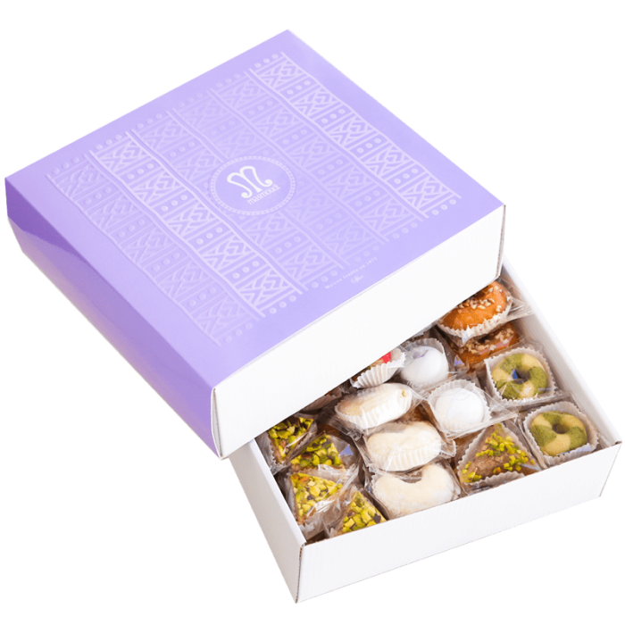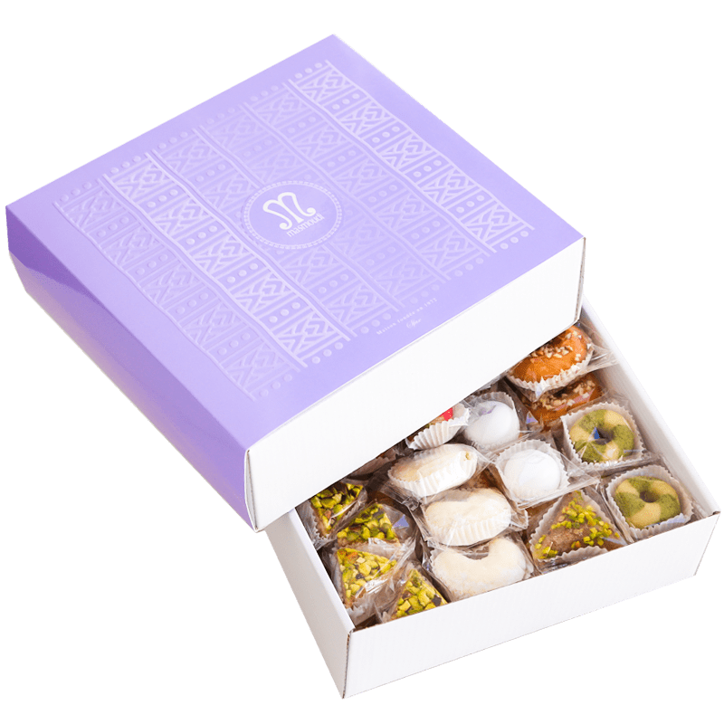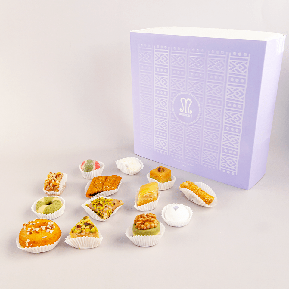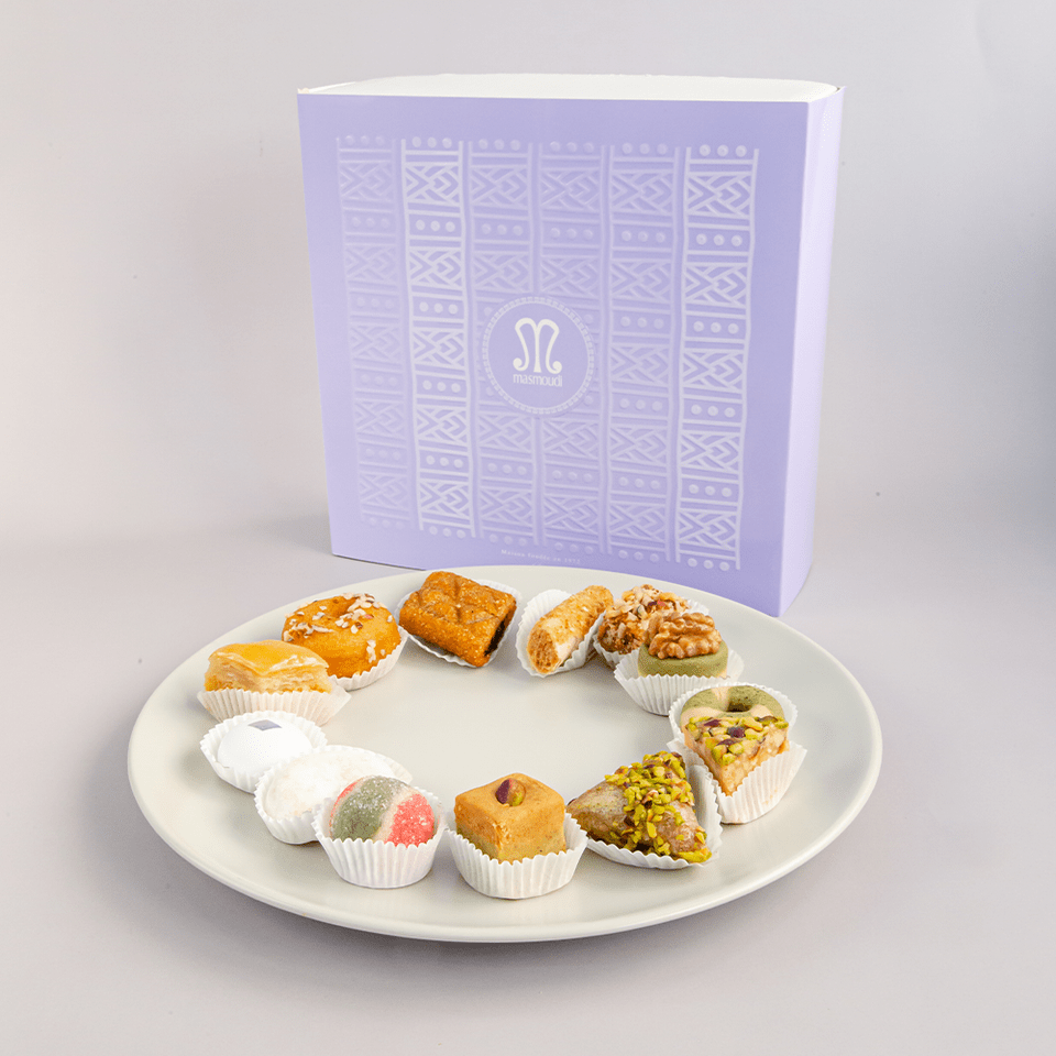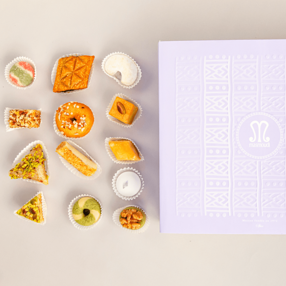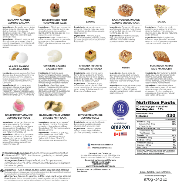 Une boite spéciale de meilleures pâtisseries traditionnelles de Masmoudi, préparée artisanalement et soigneusement pour profiter de bons moments avec vos proches, contient 53 pièces de: