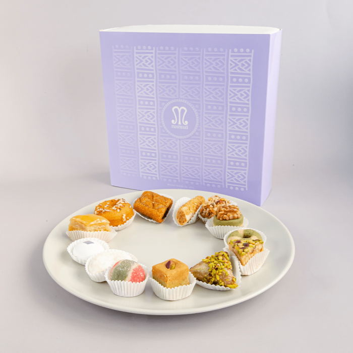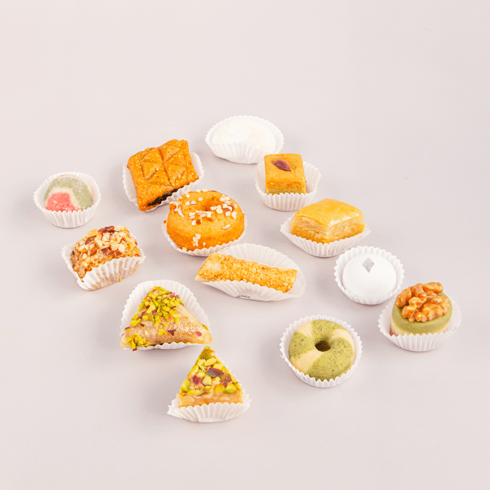 Découvrez les saveurs authentiques de la pâtisserie orientale dans un assortiment de 60 pâtisseries fines et profitez de notre offre spéciale, une symphonie de couleurs et de goûts, contient 52 pièces de: