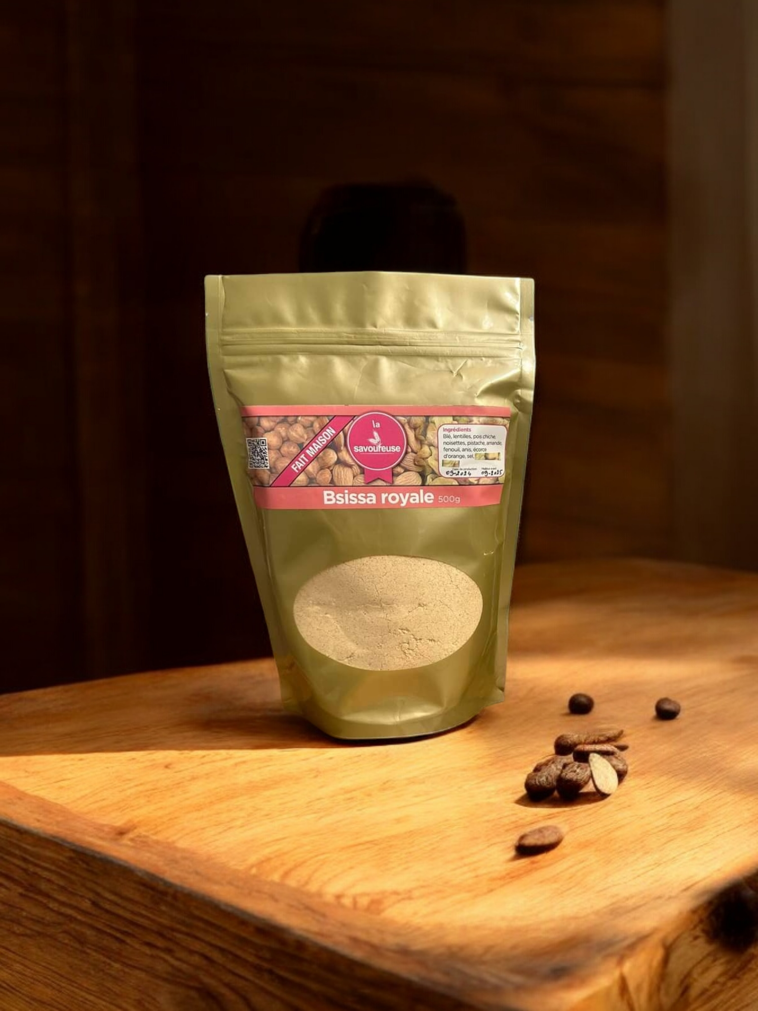 Ingrédients bsissa noisette: blé, lentilles, pois chiche, noisette, anis, écorce d'orange, sel, huile d'olive