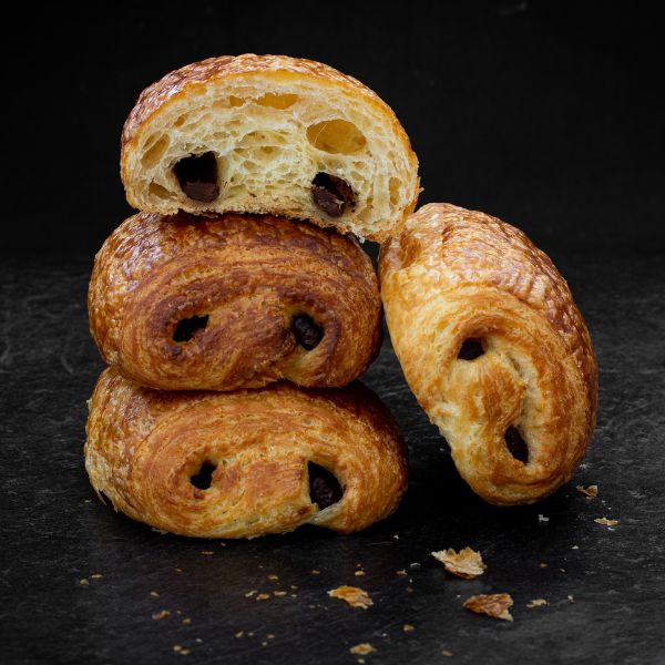 Pâte à croissant (farine, eau, beurre, sucre, levure, œufs, poudre de lait, sel) et bâtonnets de chocolat.