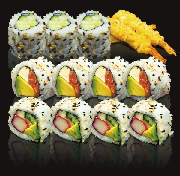 Crevette Tempura (2mcx), hosomaki concombre (3mcx), maki Vancouver (4mcx), maki California (4mcx)