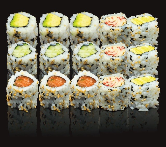 [Hoso seulement !] hosomaki avocat (3mcx), hosomaki concombre (3mcx), hosomaki saumon (3mcx), hosomaki kanikama (3mcx), hosomaki omelette japonais (3mcx).