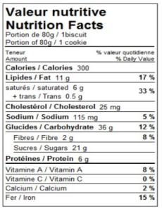 Farine (blé), cassonade, raisins, beurre, œufs entiers liquides, floçons d’avoine, poudre à pâte.