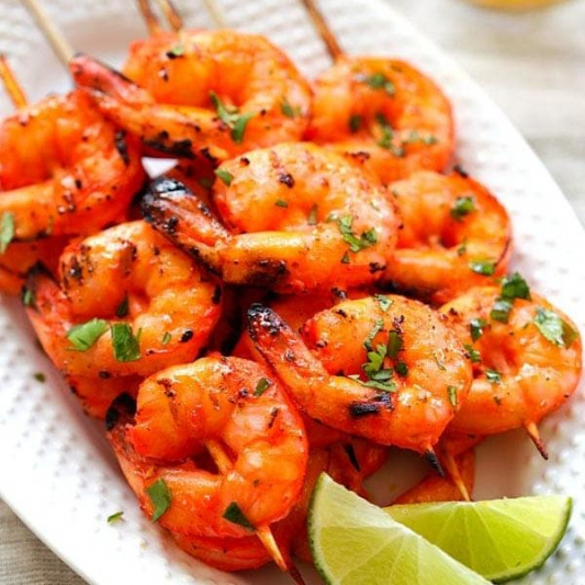 Crevettes assaisonnées d’herbes et d’épices et marinées dans notre sauce spéciale à base de yogourts et cuites sur une brochette dans notre four tandoor.