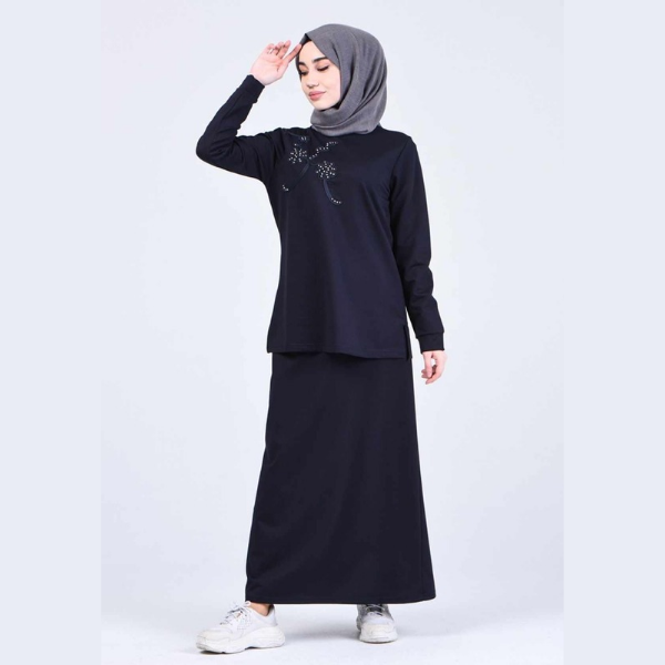Ensemble deux pièces, une jupe et une tunique, couleur bleu marine disponible en M.