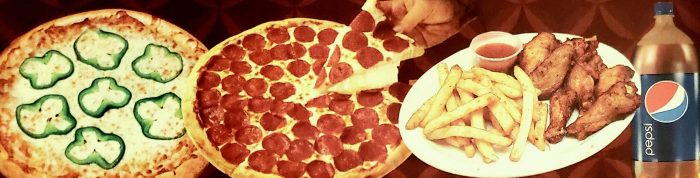Un festin Familial contient deux pizzas 12″ avec le choix d’un maximum 3 garnitures, 12 ailes de poulet servies avec frites et sauce et une boisson Pepsi 2L.
