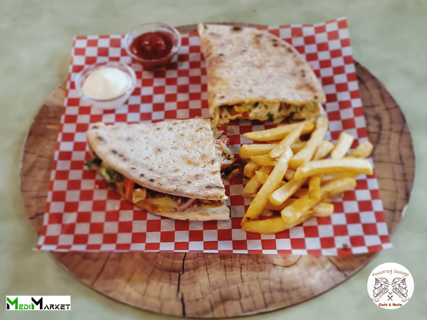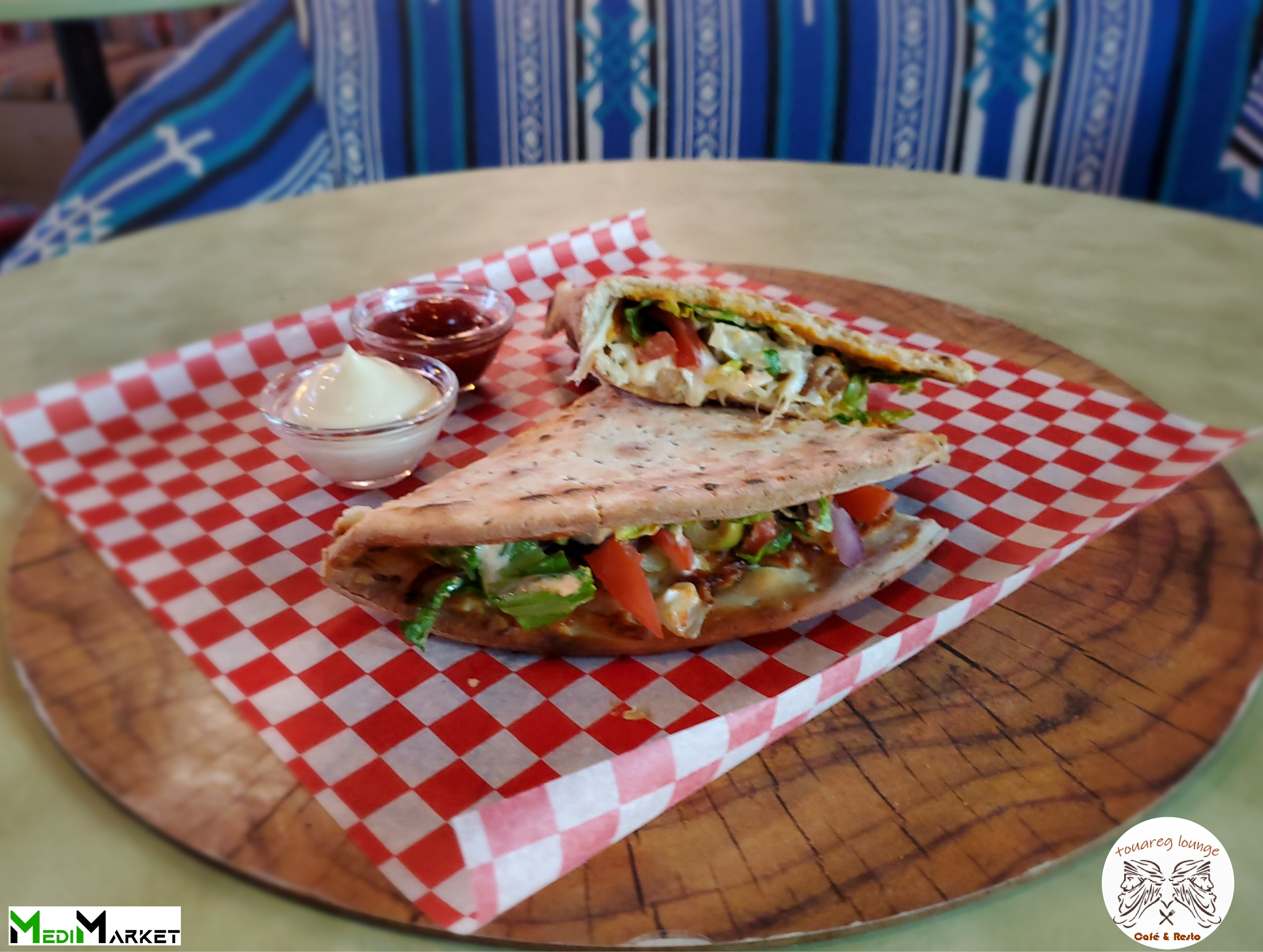 Une galette tunisienne (Makloub) faite avec un pain maison et farci de viandes, mozzarella et toutes sortes de crudités selon les choix et les envies.