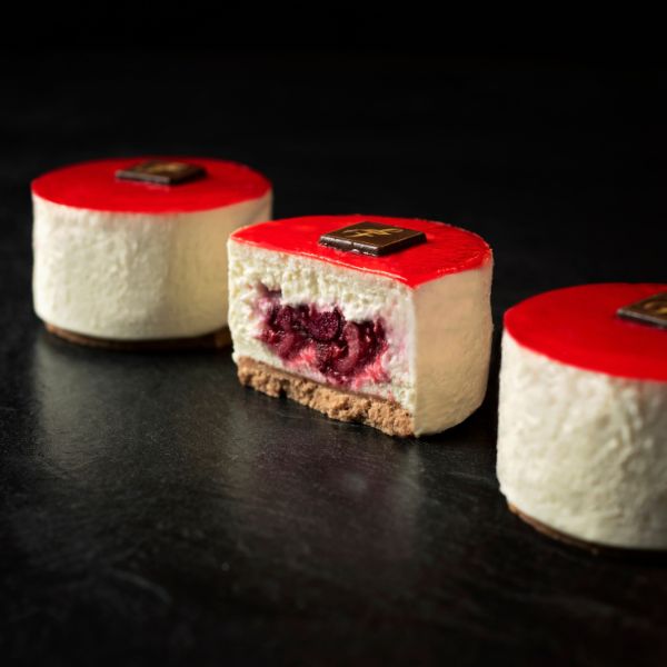 Mousse au fromage, chocolat blanc, big crunch et fruits rouges.
