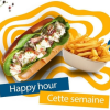 Pain brioché garni de homard frais, laitue croquante, mayonnaise citronnée, accompagnement de frites dorées et boisson rafraîchissante.