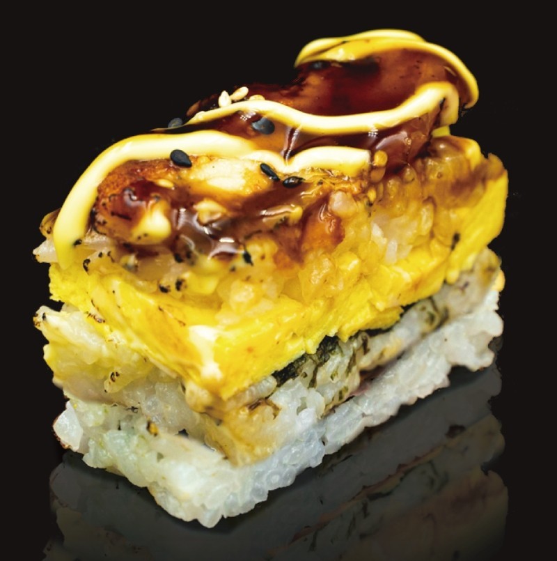 Anguille, omelette japonaise, sauce unagi, mayo japonaise, sésame et feuille de nori.