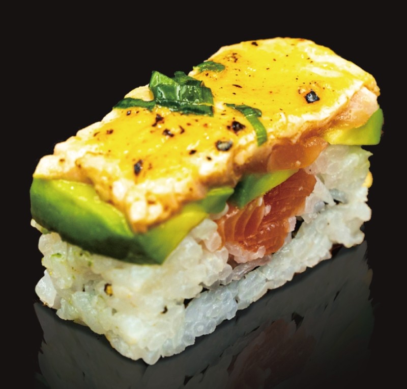Saumon, avocat, mayo épicée, poivre noir, oignon vert et feuille de nori.