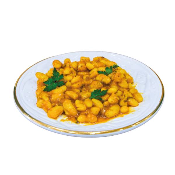 Une Entrée marocaine préparée avec des haricots blancs, des tomates, de l’ail et des épices, pour une expérience culinaire authentique.
