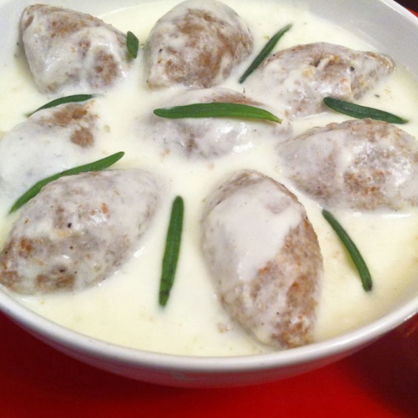 Kebbé bel laban : Délicates boulettes de kebbé servies dans une sauce au yaourt onctueuse et parfumée.