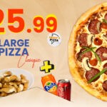 Une large pizza CLASSIQUE de taille 14″ avec 2 boissons 330 ml et une poutine régulière.