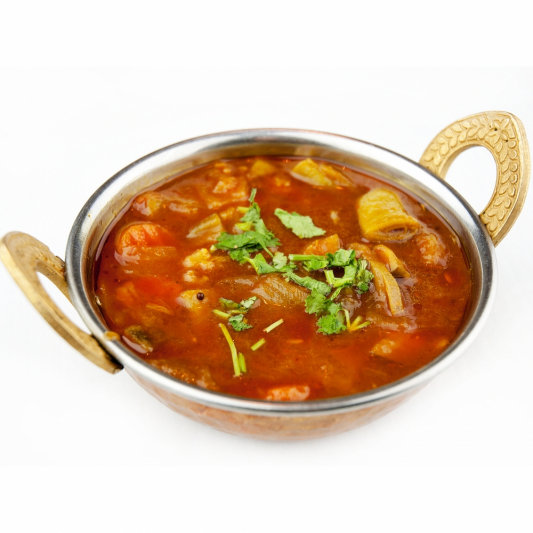 Cari piquant préparé avec des épices exotiques et garni de piments verts, oignons, tomates et coriandre.