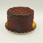 Glaçage miroir et décors cacao amère. Une explosion en bouche pour les amateurs de chocolat noir.