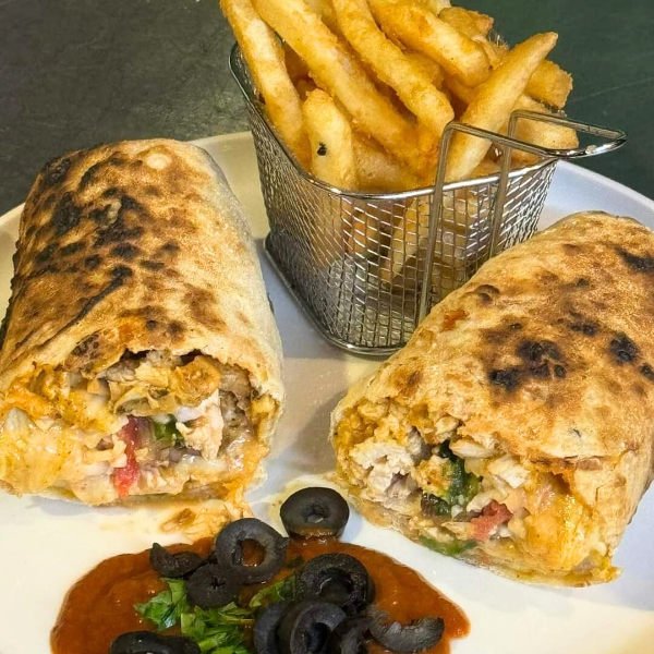 Ingrédients: Sauce fromagère, légumes sautés (oignon et poivron), frites et avec votre choix de viande
