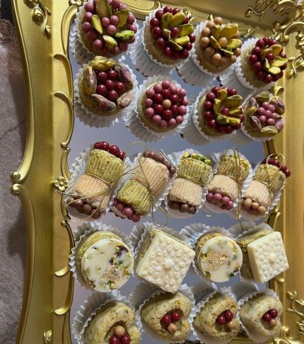 Un assortiment de mignardises sucrées, des petites gourmandises aux amandes, aux pistaches et aux noisettes, une farandole de douceurs sucrées à croquer et à partager.