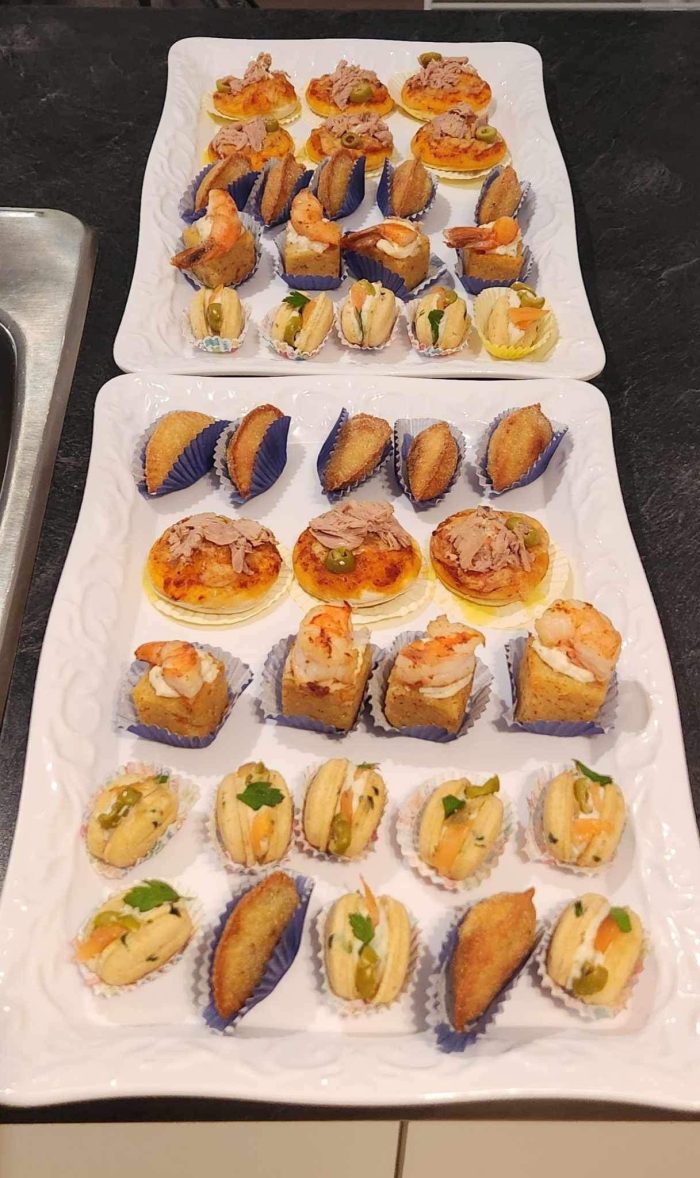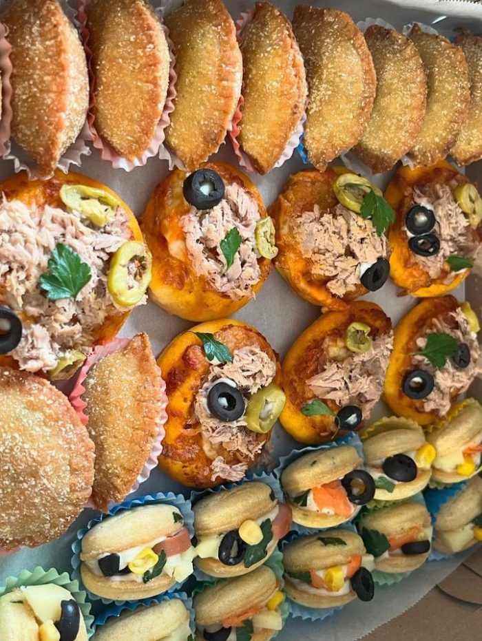 Des mini bouchés salées au thon, poulet, viande haché et saumon (entre 36 et 40 pièces). Plusieurs variétés disponibles: mini burger, zouza salé, mini sandwich, mini pizza, brik danouni..etc